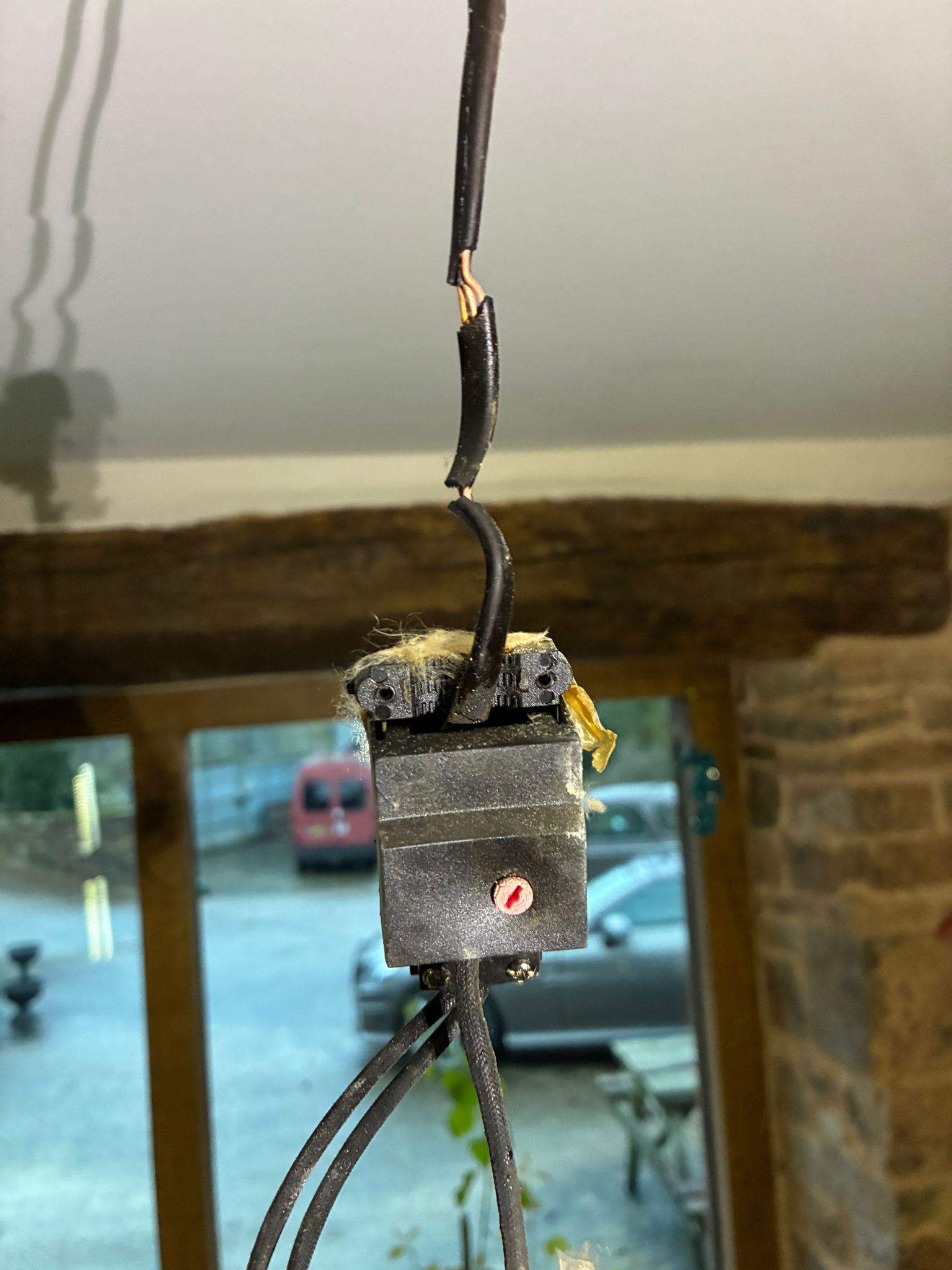 At first glance, the cable feeding the downlight appeared to be black flex, which would not be unusual in older installations.